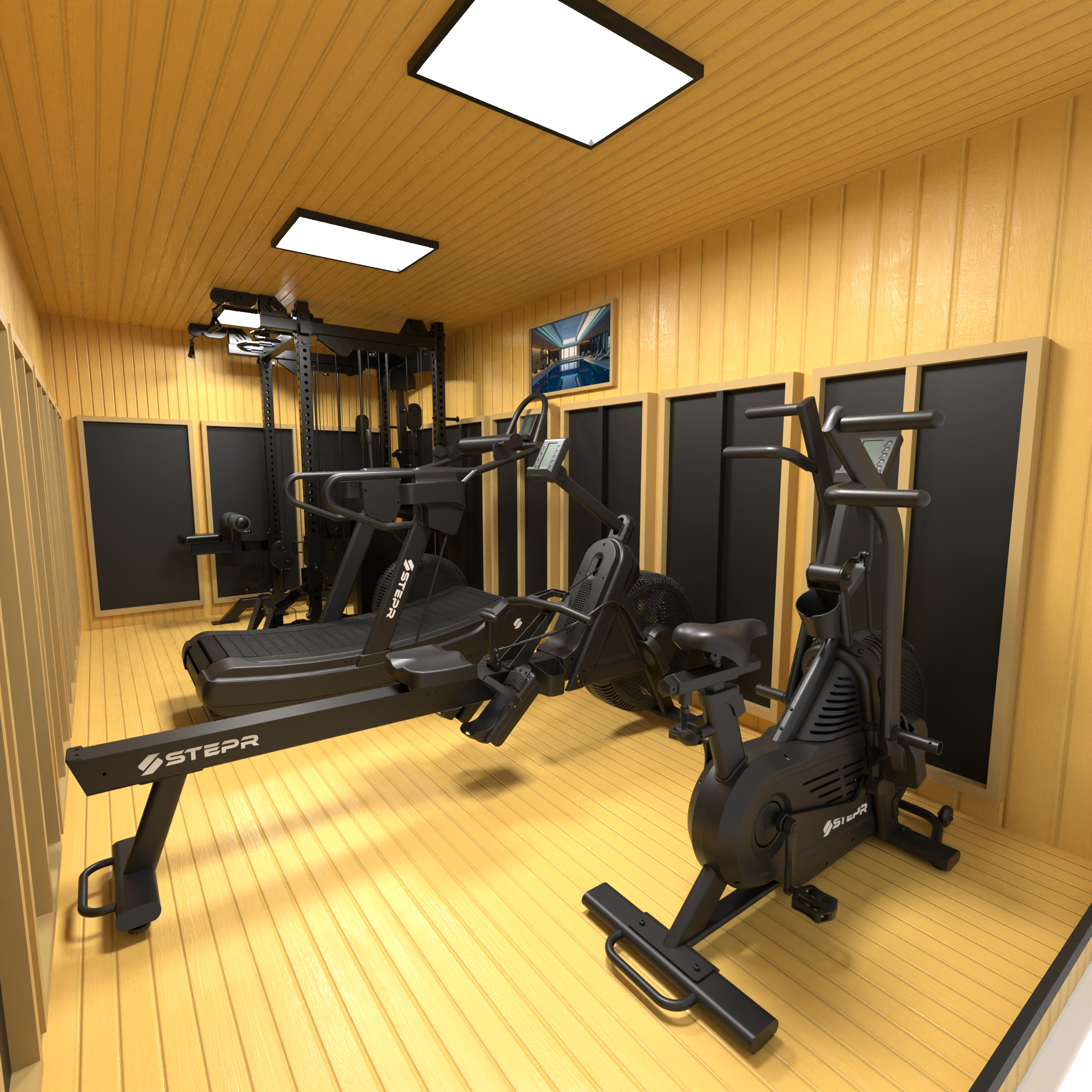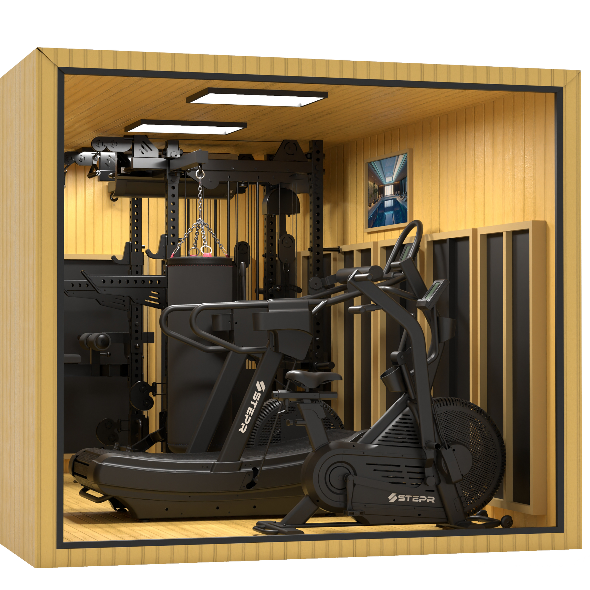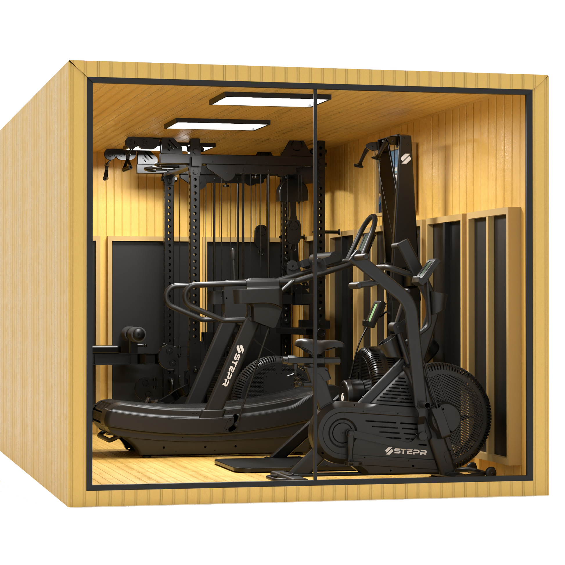 - Functional Trainer & Power Rack Combo (with plate storage holders and Olympic Bar, or built in Smith Machine) + Up to any 2 STEPR Performance Series XL VPR cardio machines